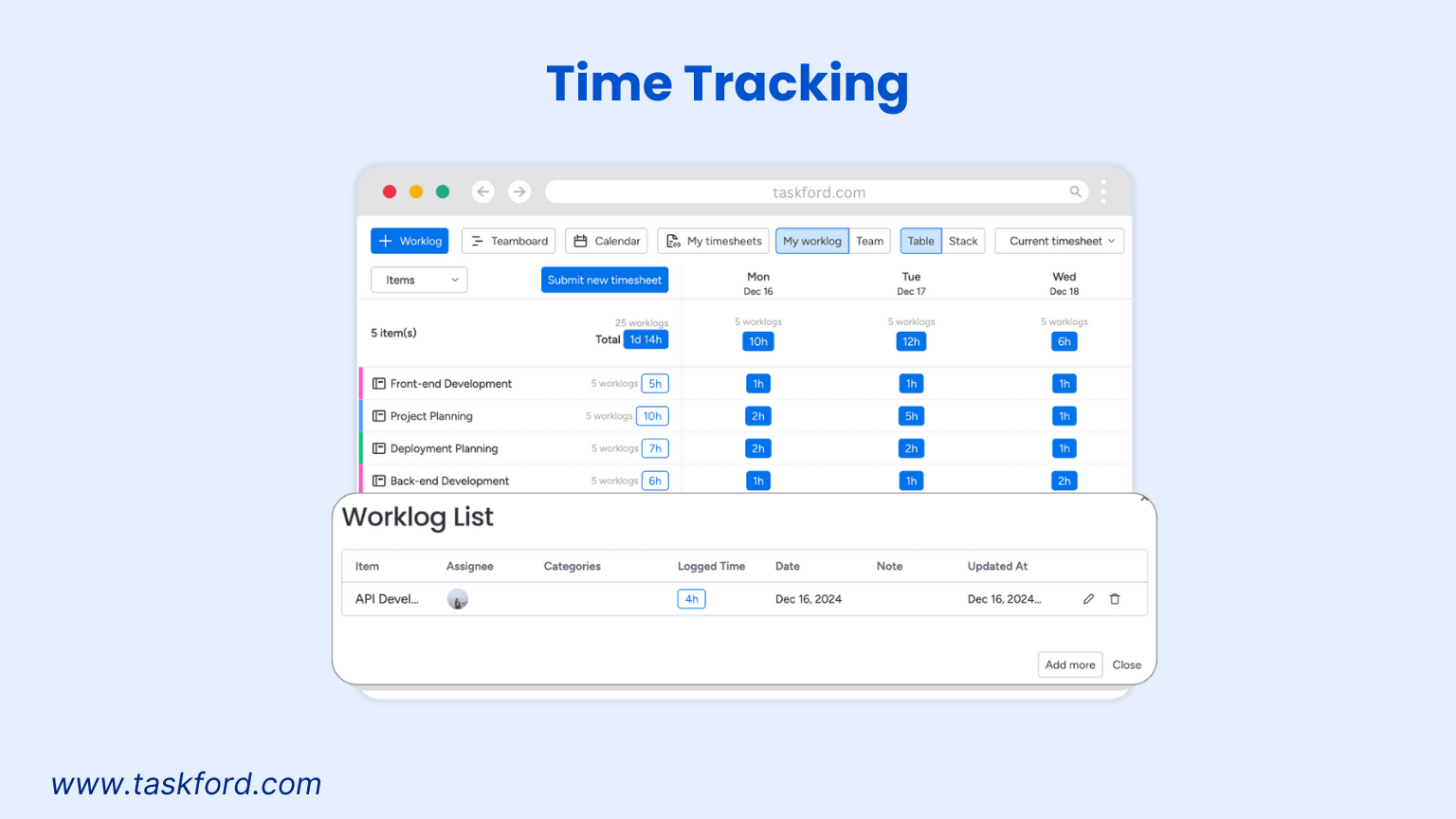 Human error is common. You might double-book or miscalculate hours in a spreadsheet. TaskFord’s timesheet management helps by organizing logged hours, but you still input data manually, risking errors.