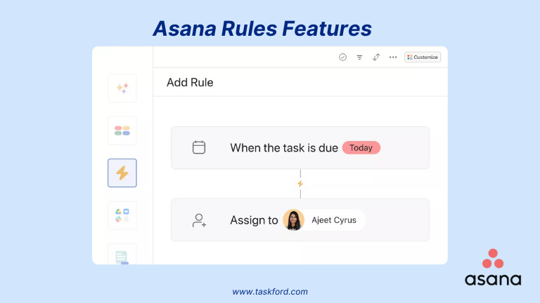 - Asana: It includes a Rules feature that allows for basic automation to streamline repetitive actions. You can set up rules to automatically assign tasks, update statuses, or mark tasks as complete when specific conditions are met. While helpful for simplifying routine workflows, Asana’s automation options are relatively limited compared to more advanced tools.