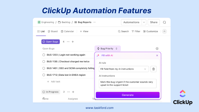 - ClickUp: It provides far more advanced automation capabilities, giving teams the flexibility to build custom workflows and automate a wide range of actions. You can set up complex triggers — such as updating statuses, assigning tasks, or sending notifications — based on specific conditions. Additionally, custom fields and task templates make it easy to tailor workflows to your team’s unique processes, reducing manual work and improving efficiency across projects