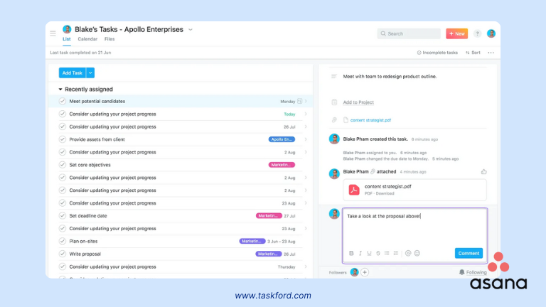 - Asana: Asana makes team collaboration simple and organized. You can comment directly on tasks, tag teammates with @mentions, and attach relevant files — keeping all communication in one place. This eliminates the need for scattered chats or emails and ensures everyone stays on the same page. Another standout feature is task dependencies, which let you link tasks together so one can’t start until another is completed. This is especially helpful for managing workflows or projects with multiple handoffs.