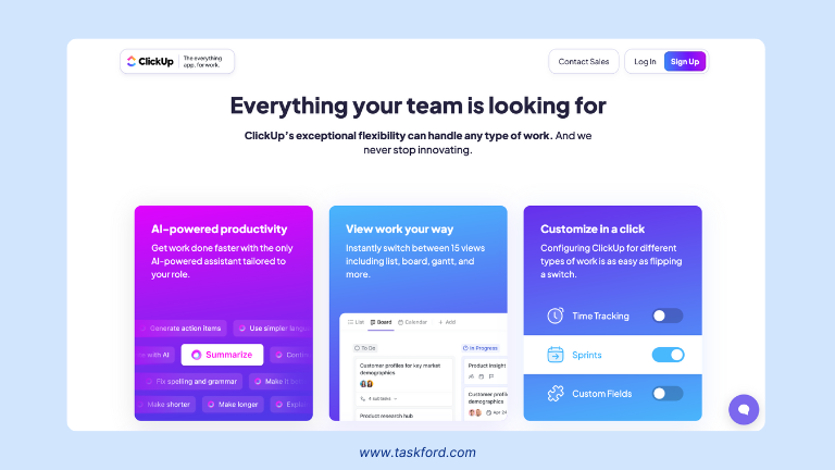 - All-in-One Platform: Combines task management, docs, time tracking, goals, and more in a single workspace.