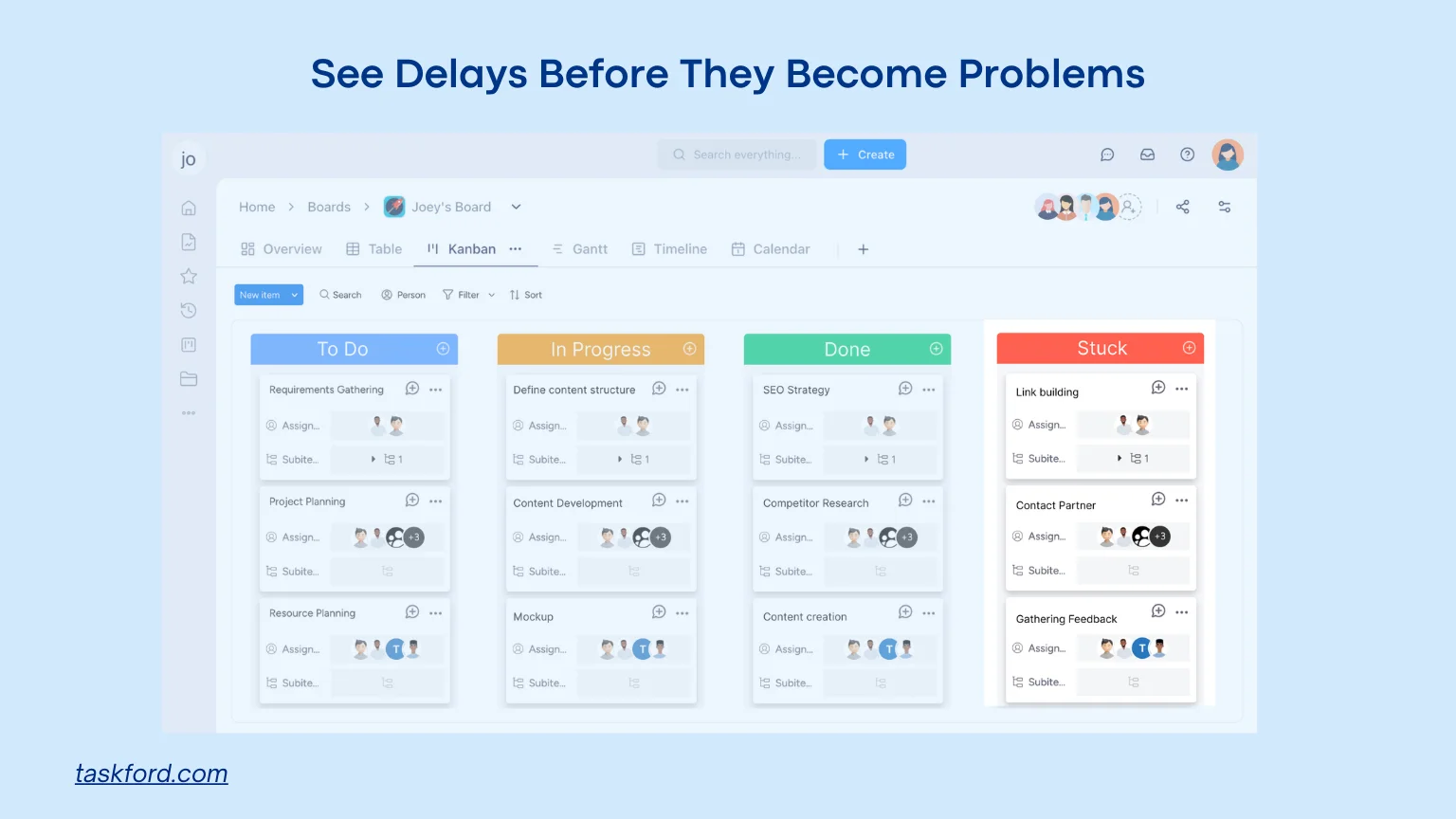 TaskFord, an integrated work delivery platform, makes execution reality visible early. It exposes the signals that traditional tools delay or hide, so teams can act before confidence collapses.