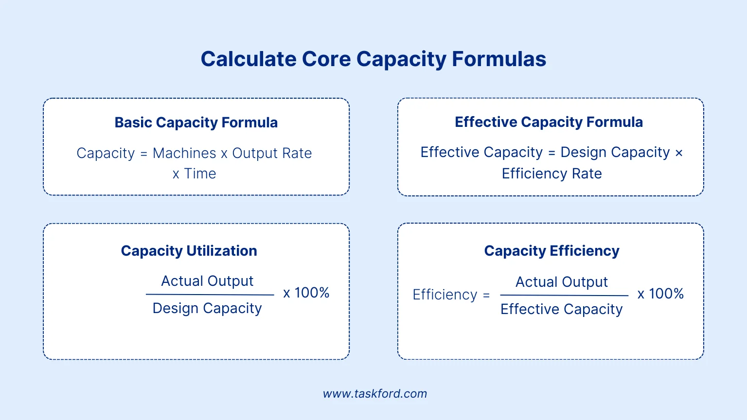 Underestimating capacity can lead to missed deadlines and unsatisfied customers. Overestimating it can inflate costs and idle assets. To manage this balance, you need a clear understanding of what type of capacity you are measuring and how to calculate it effectively.