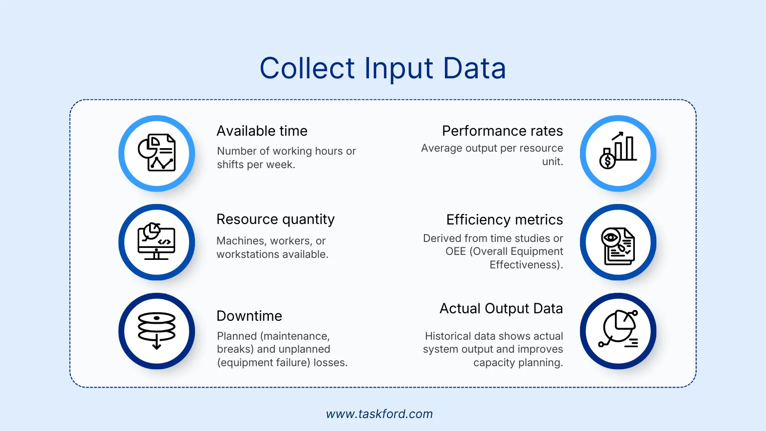 Accurate input data is essential for meaningful capacity analysis. Common data points include: