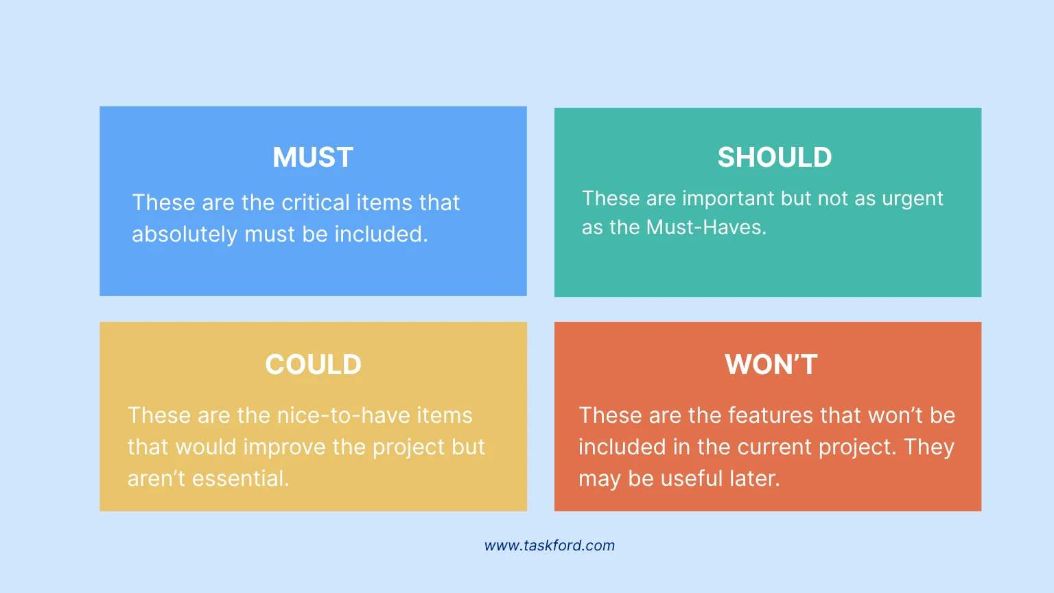 - Won’t-Have (for now): Items that are not needed for the current cycle. They might be revisited later, but aren’t a priority right now.