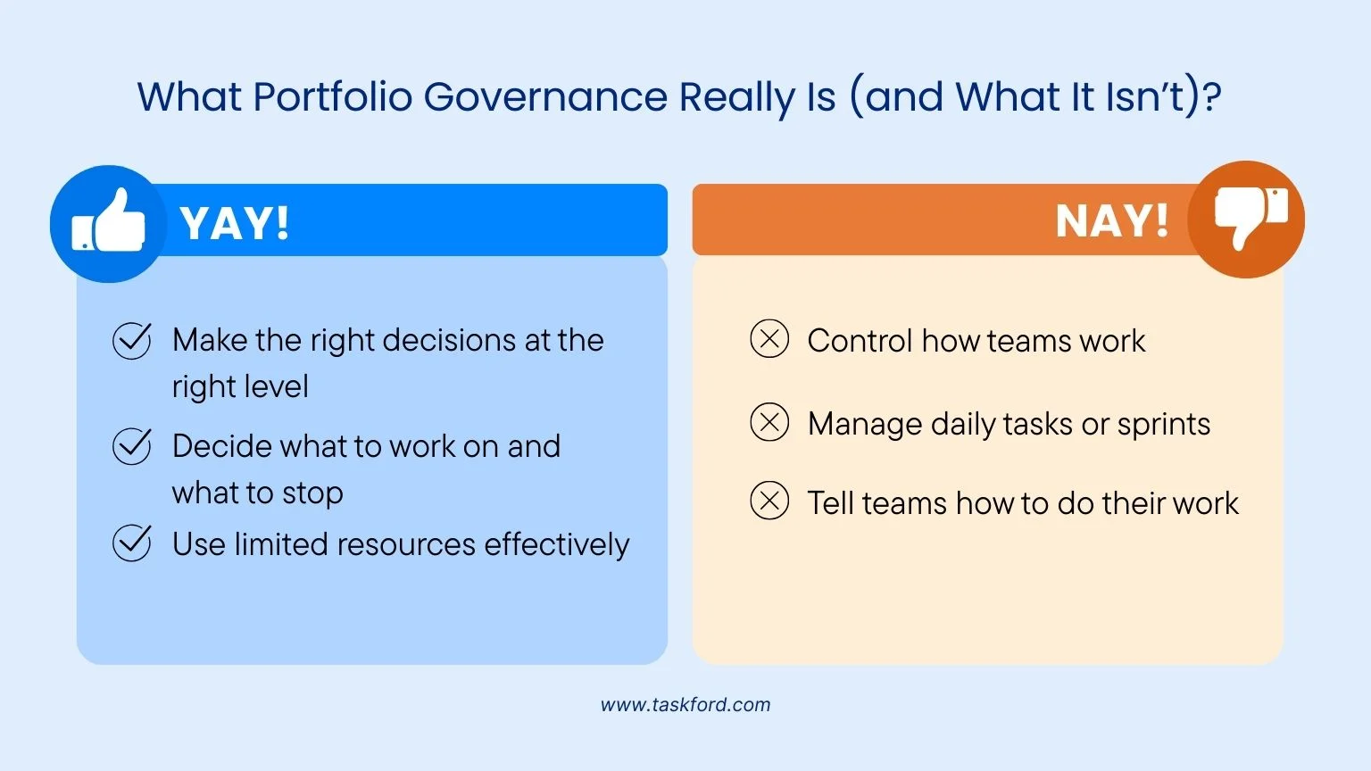 Portfolio governance does not manage people or daily work. It manages decisions and trade-offs at the portfolio level.