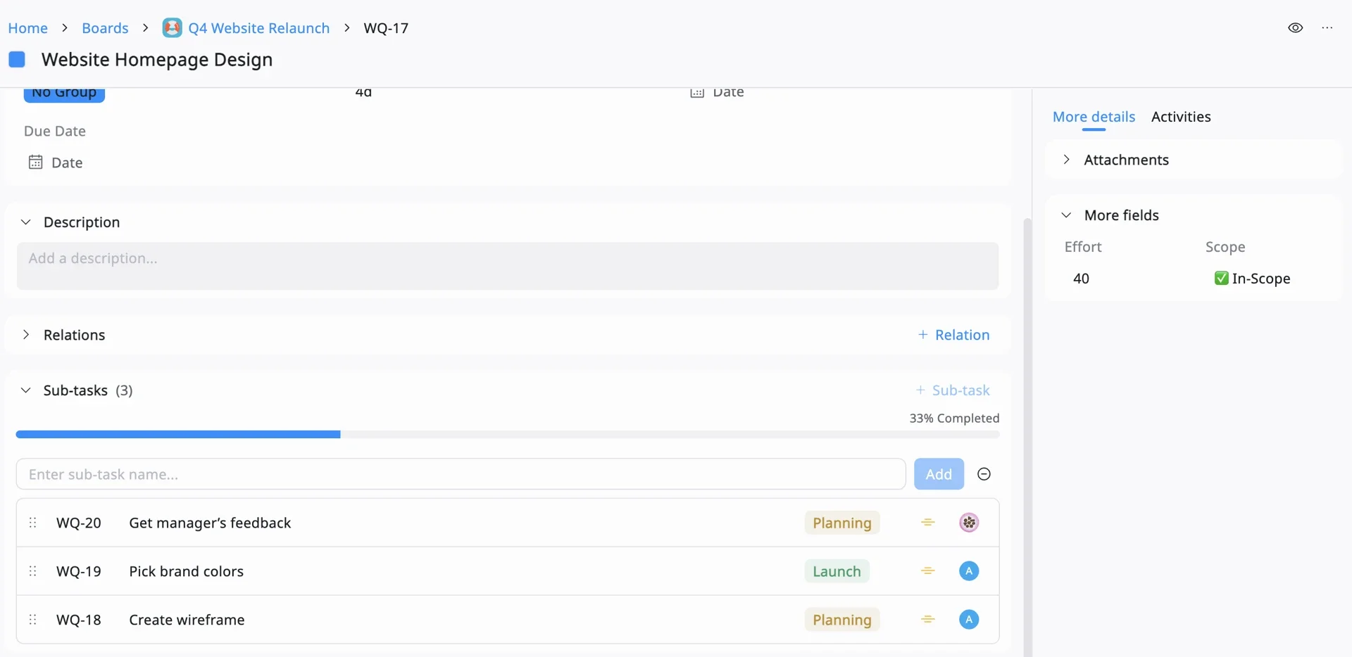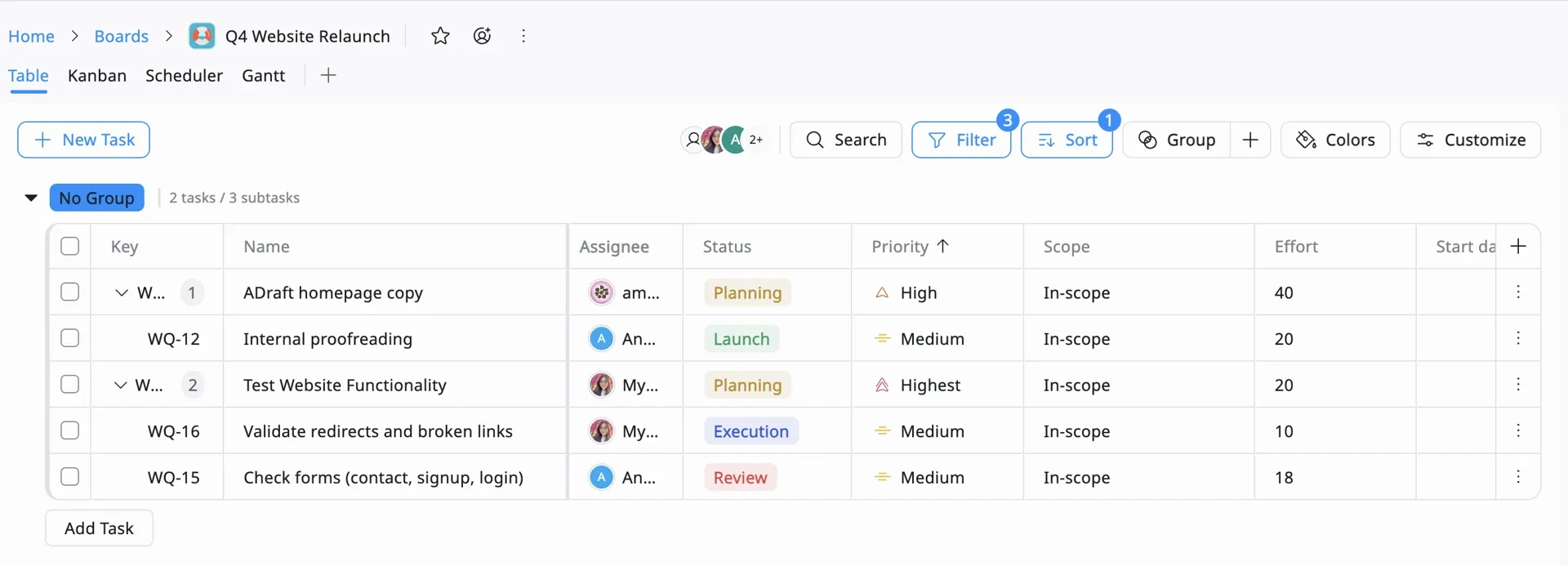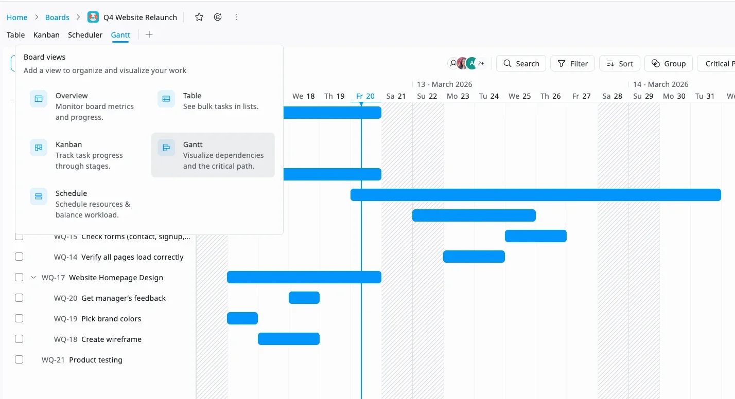 | Project | Create a Board (e.g., Q4 Website Relaunch). Start with Table or Kanban view, you can switch to Gantt later. |