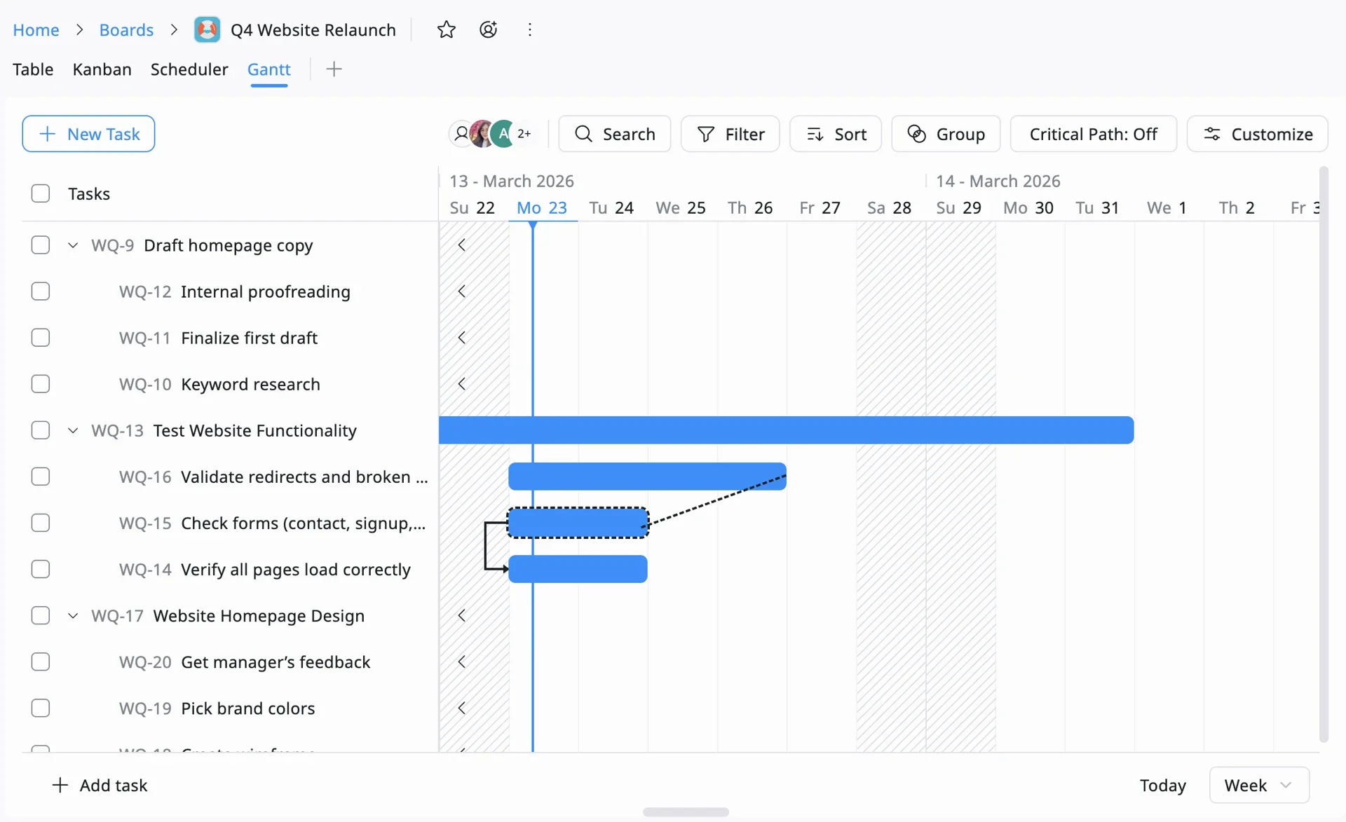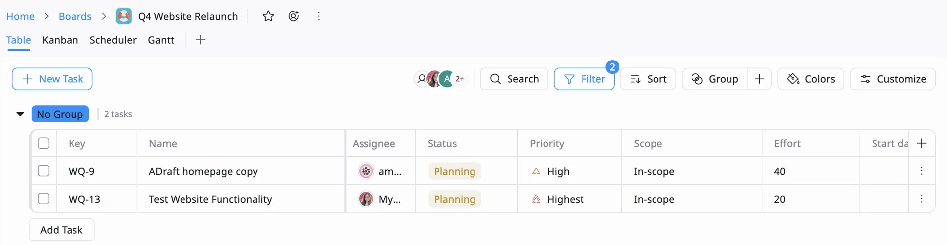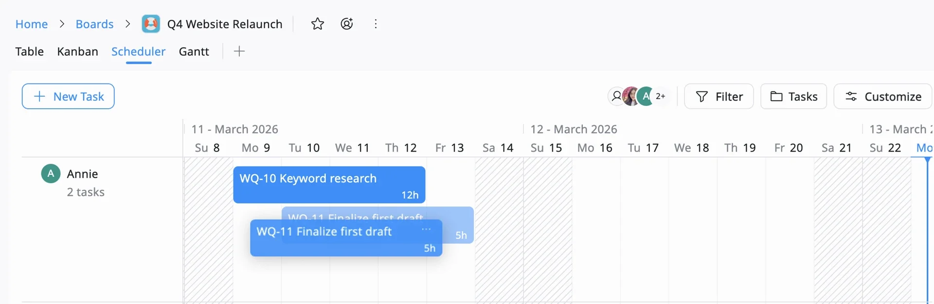 | Project | Create a Board (e.g., Q4 Website Relaunch). Start with Table or Kanban view, you can switch to Gantt later. |