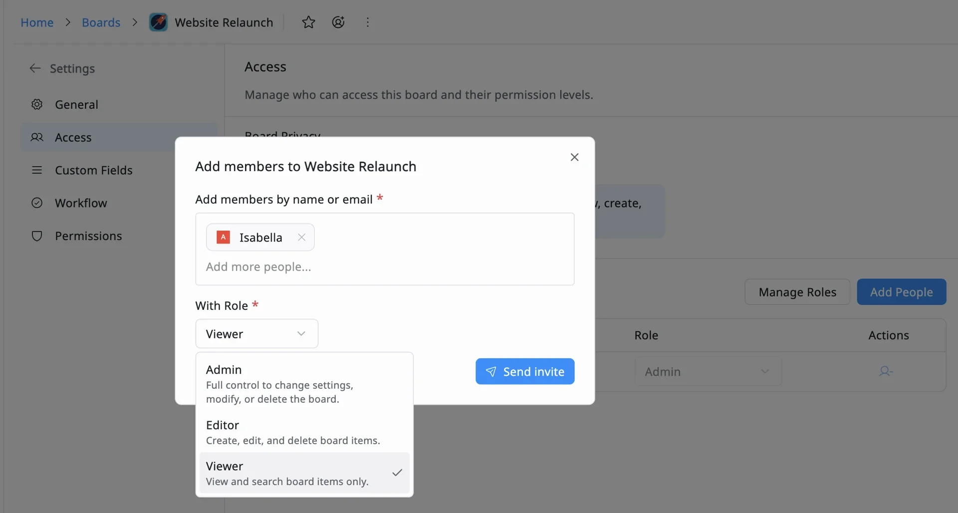 - Set Board Permissions: Use TaskFord’s roles to define how the team interacts with the plan: