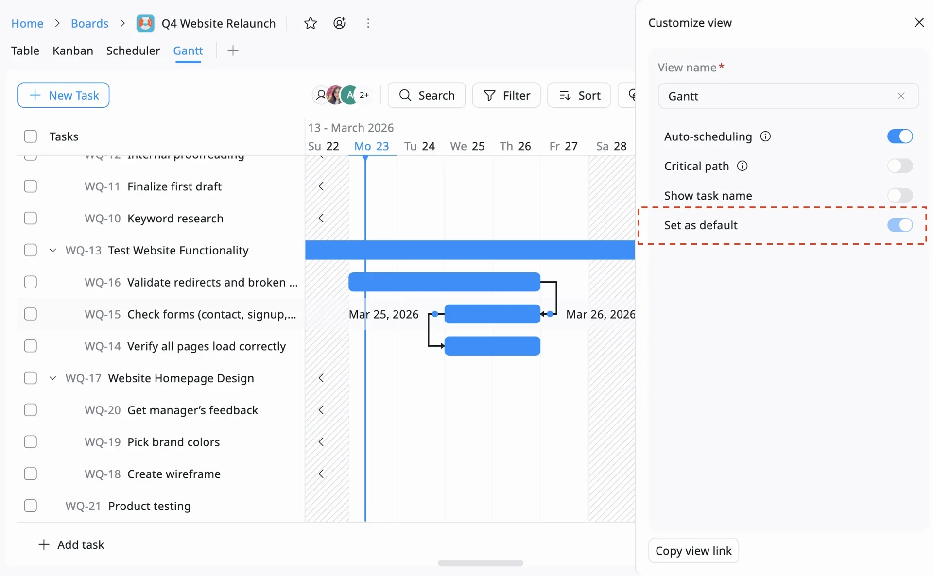 Once your timeline looks perfect and the dependencies are connected, make sure your team sees it this way.