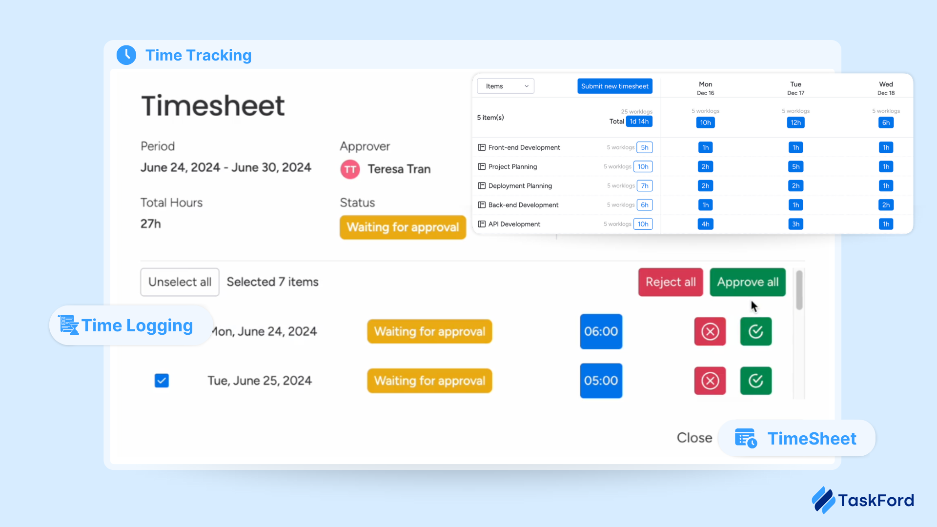 TaskFord provides visibility into team availability and workload across projects. Managers can see who is assigned to what, identify over- or under-utilization, and make informed allocation decisions. This helps teams balance capacity, avoid burnout, and plan work more realistically as priorities change.