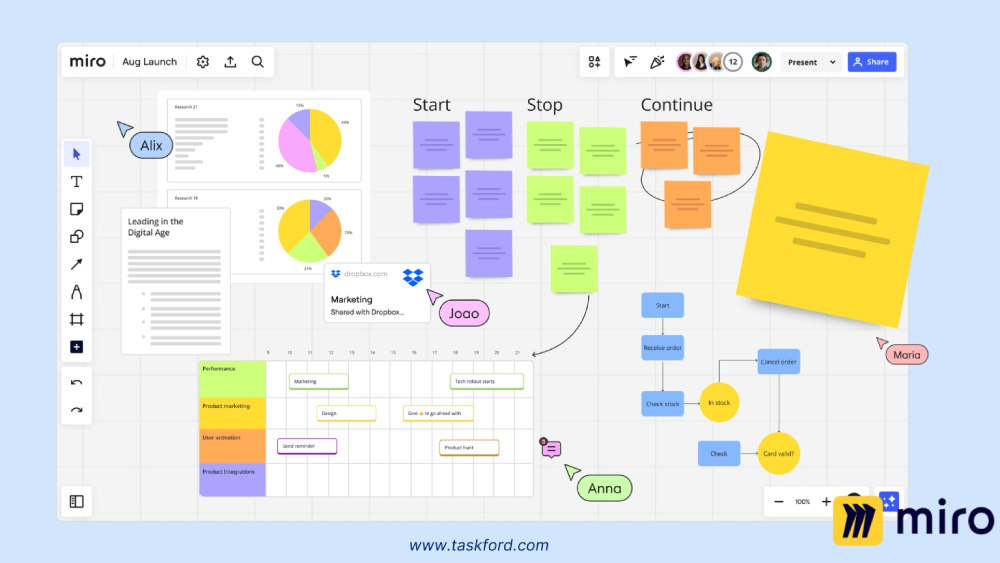 Miro is a visual collaboration platform with project management capabilities, excelling in brainstorming and creative workflows. Its digital whiteboards enable teams to collaborate on ideas, plan projects, and visualize workflows, making it a favorite for creative and design-focused teams. While not a traditional project management tool, its Kanban boards and task management features support lightweight project tracking, ideal for teams that prioritize ideation and collaboration.