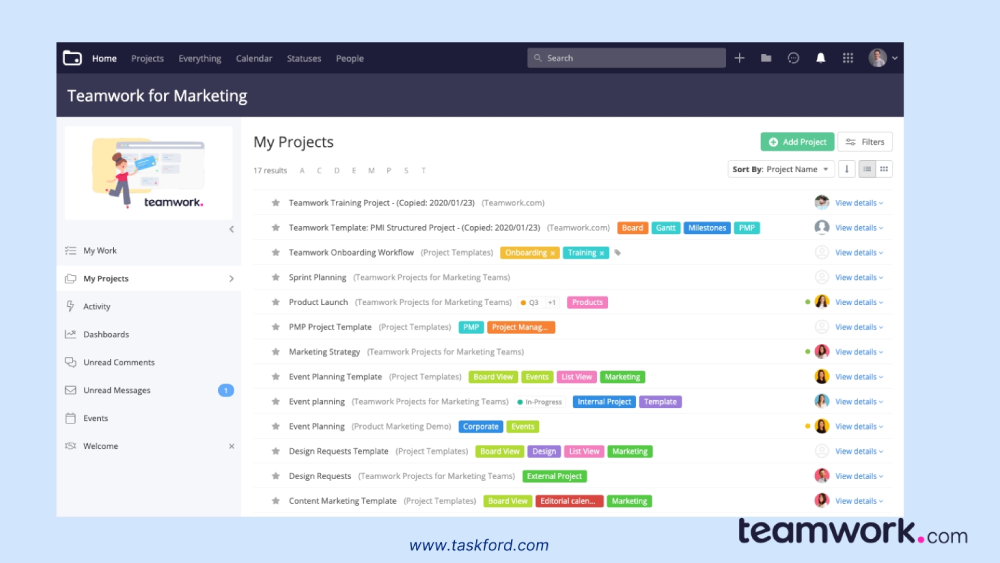 TaskFord combines project planning, resource management, time tracking, and cost control in one platform. It supports Gantt charts, dependencies, and portfolio views, making it well suited for complex or multi-project teams. Built-in workload visibility and real-time budget tracking help teams plan and deliver work more reliably.