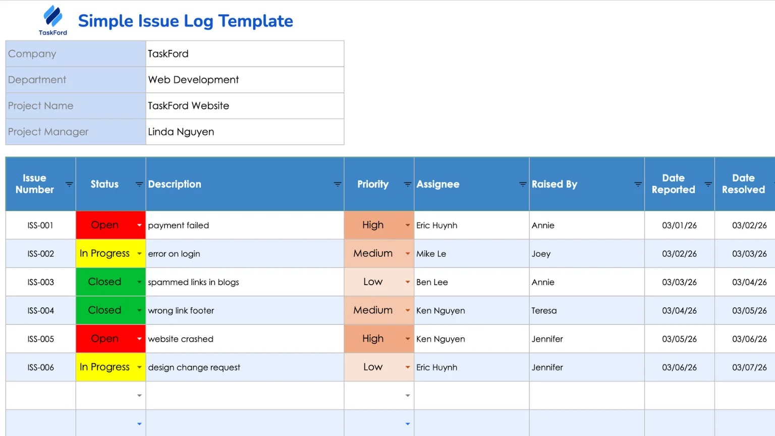 An issue log may seem simple, but it plays an important role in project management. Every project will face problems. What matters is how quickly and clearly those problems are handled.