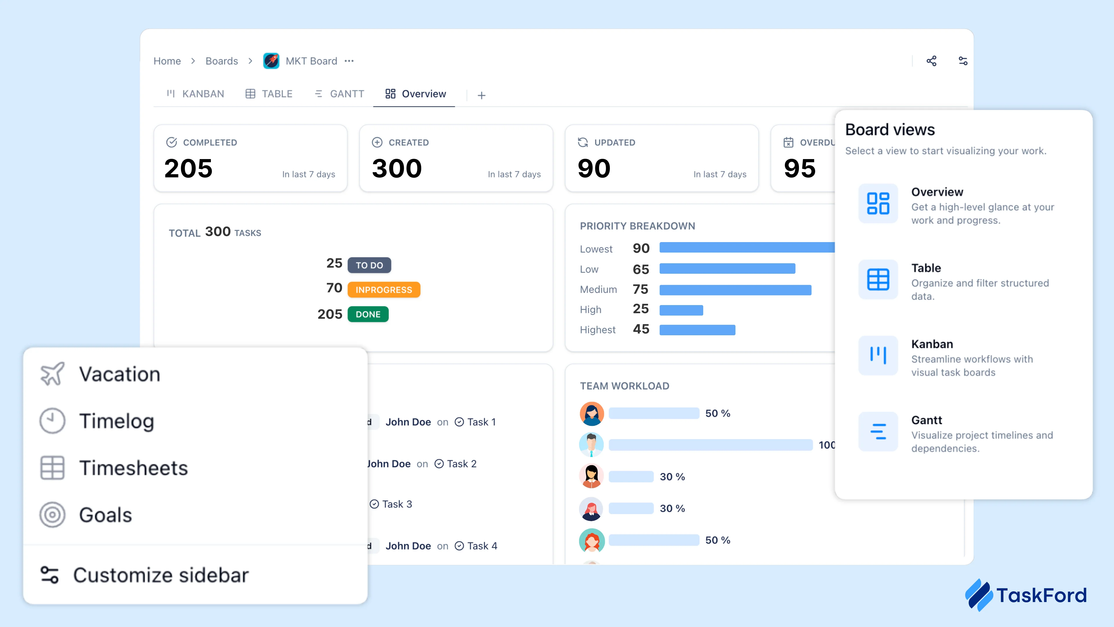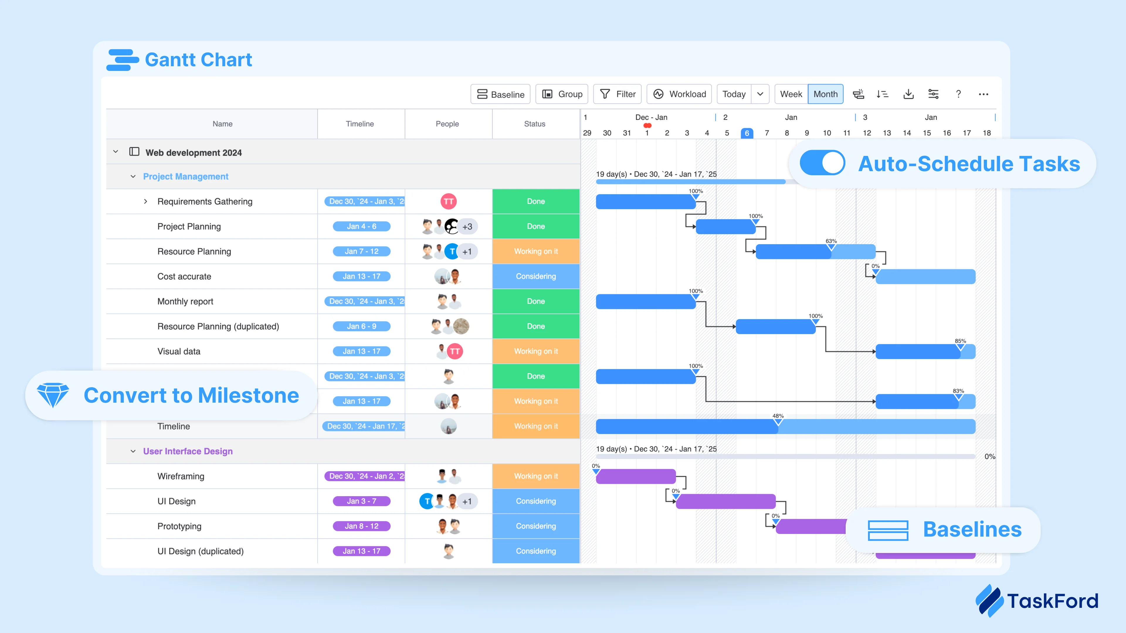 TaskFord brings together task management, project planning, and resource visibility in a single workspace designed for managing ongoing work. Teams organize tasks using Kanban boards and project views, while managers plan delivery with timelines and Gantt charts to understand progress and dependencies across projects.
