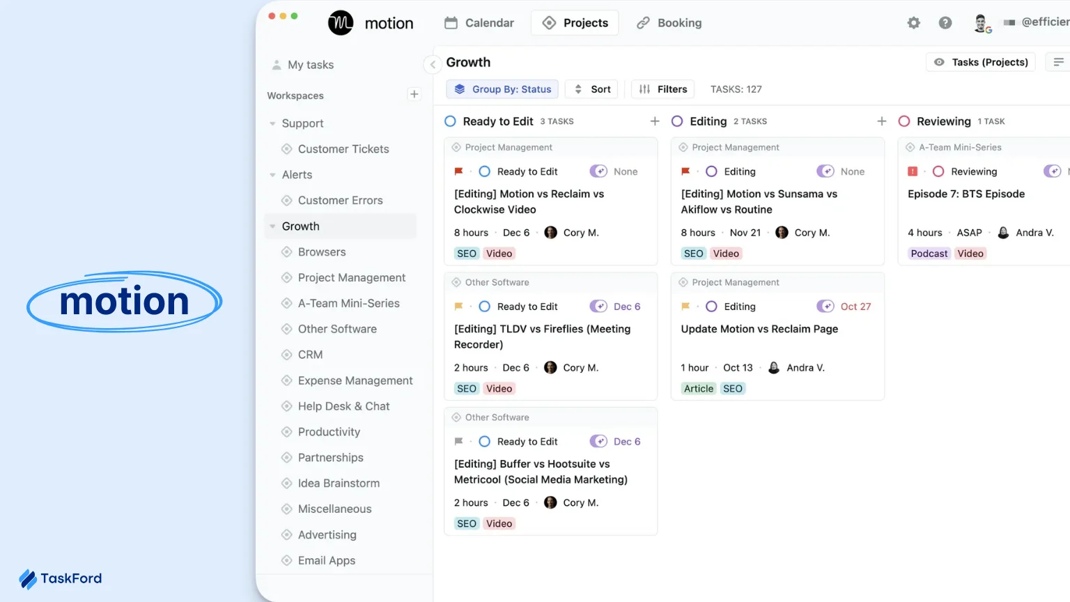 Scheduling is handled automatically. Motion analyzes calendars, working hours, and deadlines to adjust plans in real time, reducing the need for manual rescheduling when priorities shift.