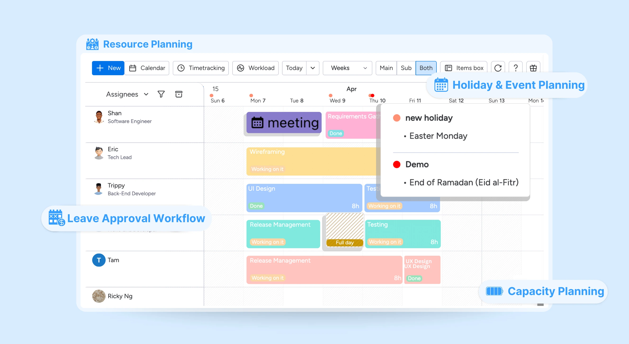 Handle holidays, approvals, and capacity planning in one integrated view.
